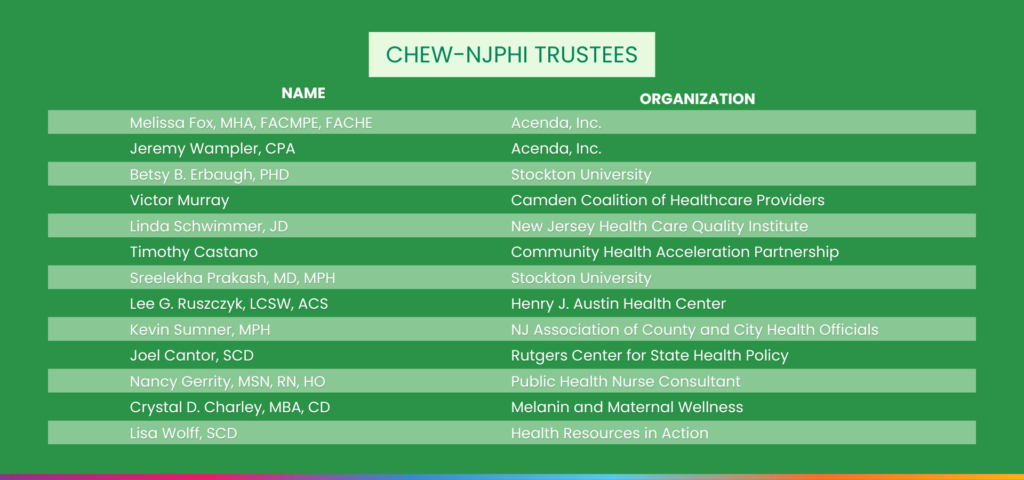 Known for collaborative, community-centered leadership, Dr. Anderson brings people together to turn data, policy, and lived experience into practical solutions. Under her leadership, CHEW–NJPHI is launching place-based Health Opportunity Zones, strengthening civic engagement and policy partnerships, building a diverse public health workforce, and expanding the use of evidence-based prevention and care, so every New Jerseyan has a fair chance to be healthy.